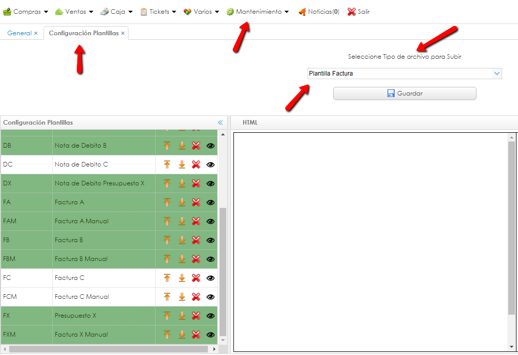 Lo primero que debe hacer, es dirigirse dentro del sistema a Mantenimiento > Configuracion Plantillas. Una vez dentro, seleccionaremos el tipo de archivo a subir/modificar, en este caso, ‘Plantilla Factura’.