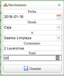 Para el ejemplo vamos a considerar que estamos pagando la compra de 2 Lavandinas para limpieza. Para ello optamos como Origen ‘Caja’ y como Destino ‘Gastos de Limpieza’, donde tambien, informamos un comentario o detalle del mismo