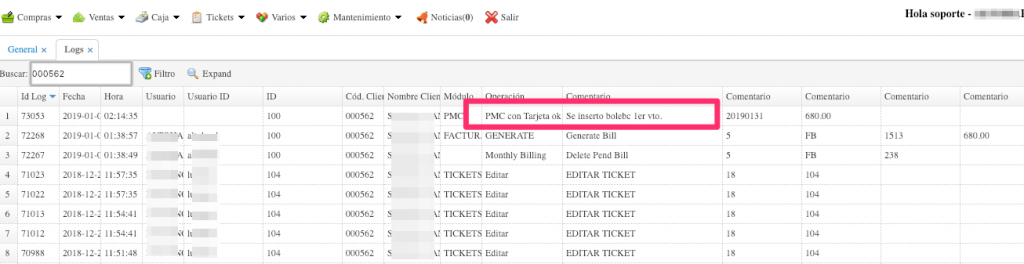 4) Para verificar si los archivos se presentaron correctamente a Cobro Digital, debera ingresar al Menu: Mantenimiento>Logs>Log General y ahi debemos buscar el codigo de Cliente que nos esta efectuando el reclamo y podemos revisar cual es la situacion de ese registro: